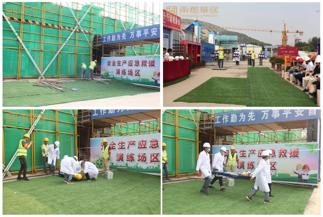 观摩会上,东郡华庭现场施工人员和管理人员进行了“工地现场意外事故救援模拟演练”,向各位参会人员做了生动形象的演示,获得了大家的高度评价。同时东郡华庭项目建设单位负责人高经理分享了开发商在对工程现场安全、施工管理的标准和要求;施工单位龙元建设陈经理汇报了工地现场安全文明管理的经验与执行贯彻情况。